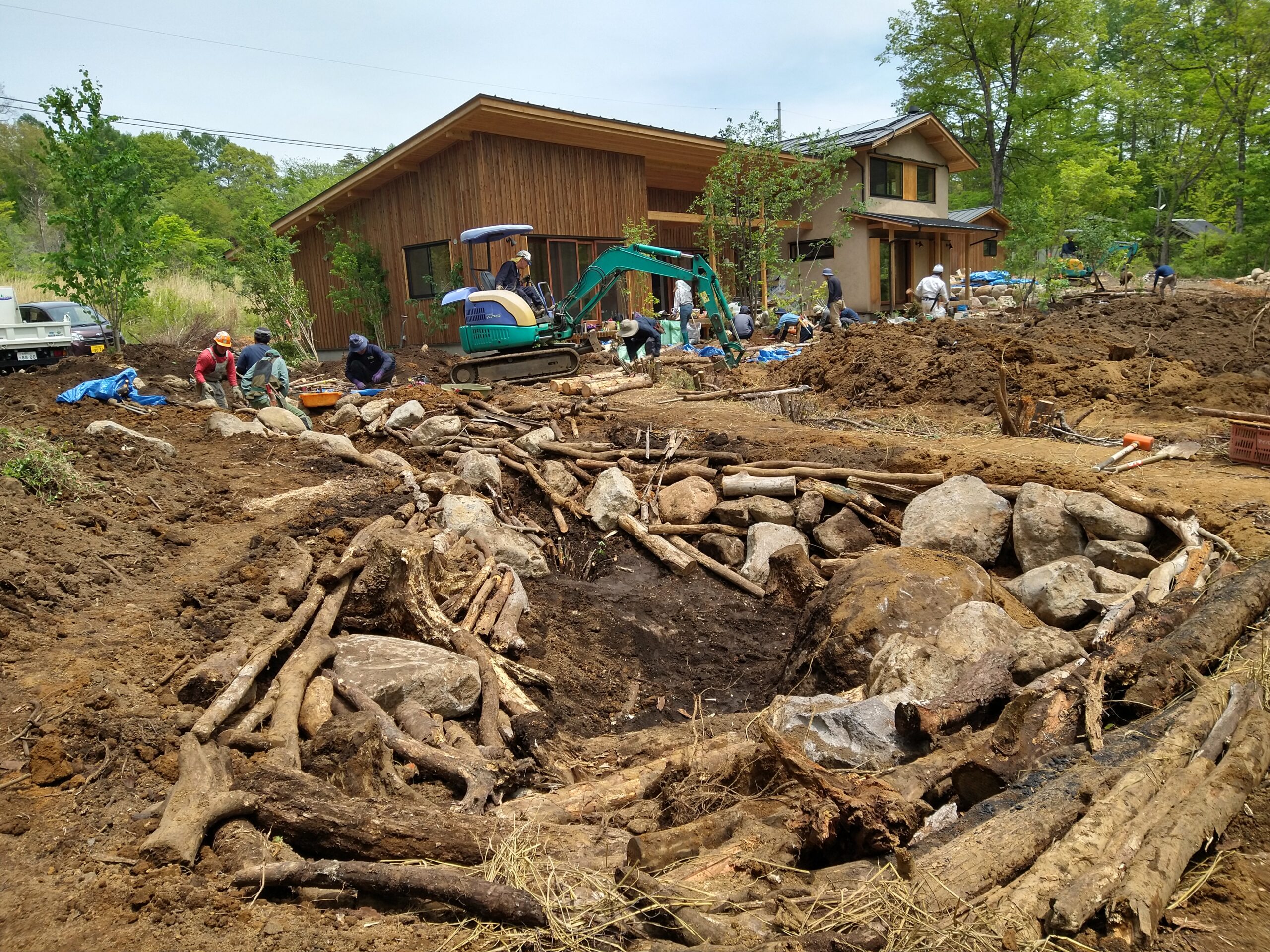 土中環境改善の施工を施した敷地に防腐剤や化学薬品を極力使用しない自然素材の建物。庭に降りると風に揺れる梢や小鳥たちのさえずりと共に、水と空気が地中と地上を循環する心地よさを実感できます。自然の力だけでなく、人の力だけでもない。自然と人の合作としての空間です。