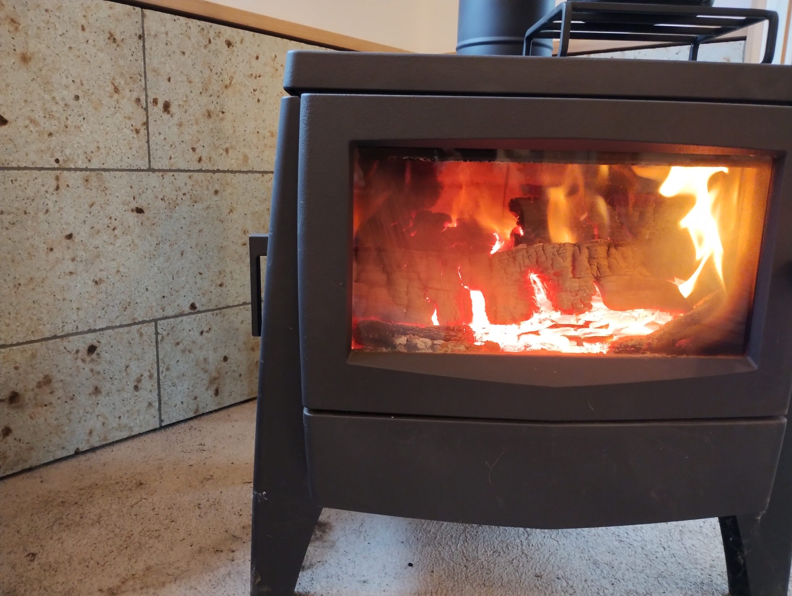 薪ストーブのそばで暖かな炎の揺らめきを眺めながら